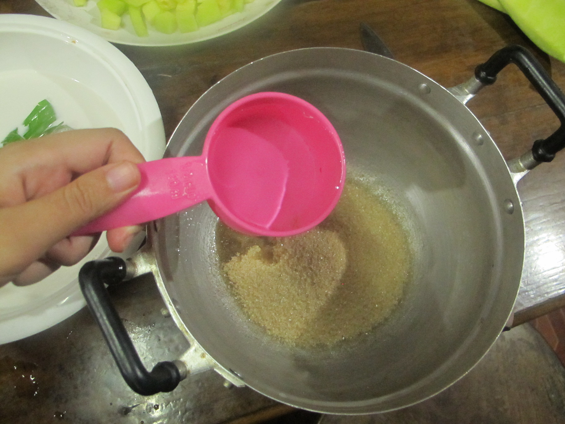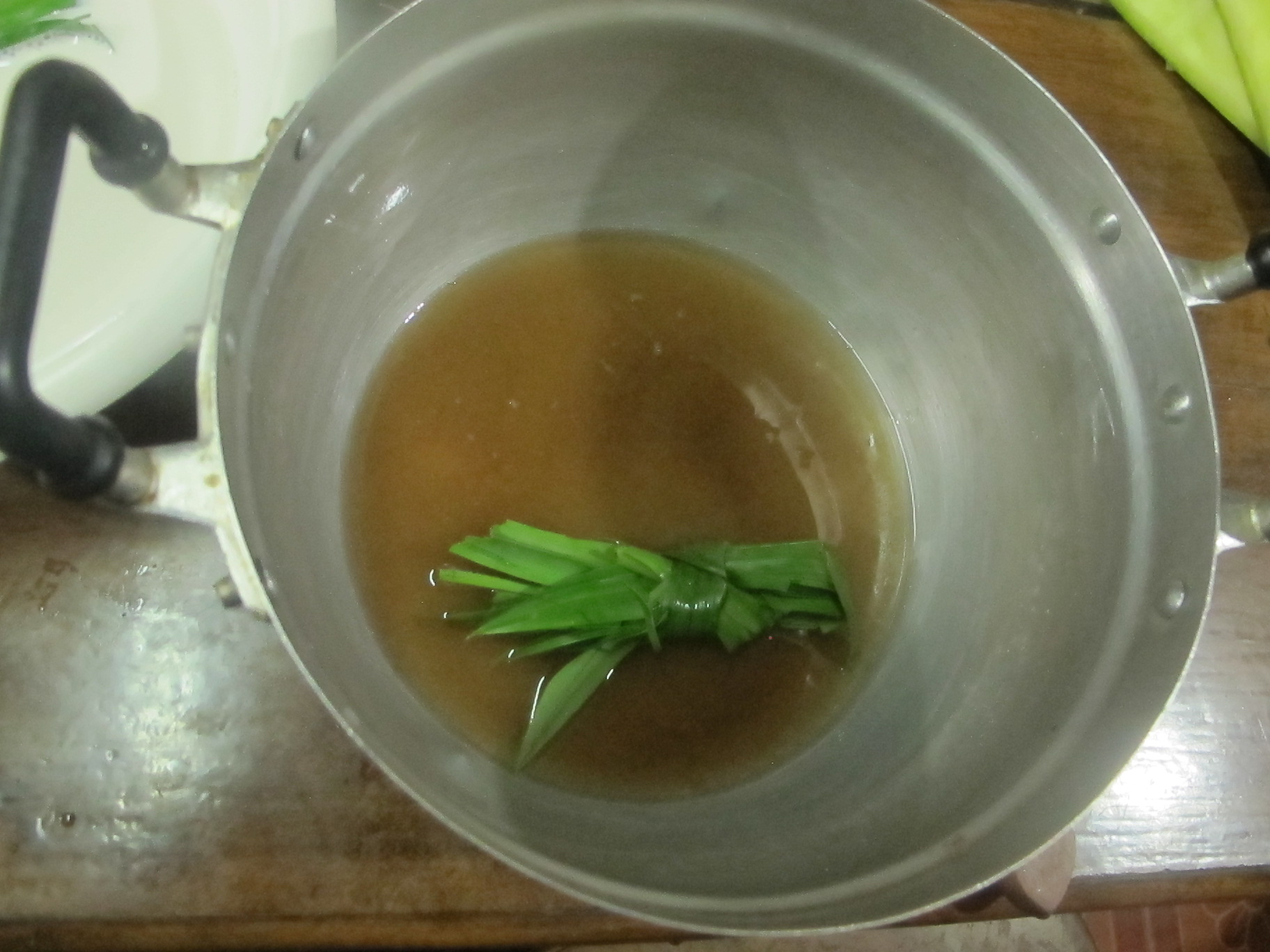 ต่อด้วยน้ำเชื่อมค่ะ เทน้ำตาลทราย น้ำเปล่า ใบเตยลงหม้อ ตั้งไฟให้น้ำตาลละลายค่ะ
