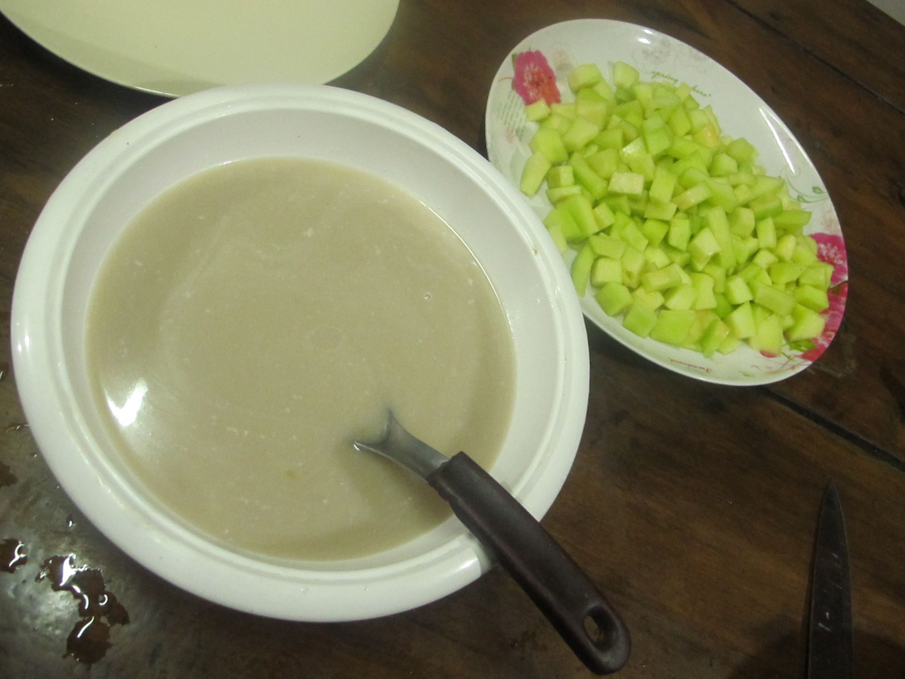 ขั้นแรกเรามาเตรียมแตงไทยกันค่ะ คว้านใส้ออก เอาให้เกลี้ยงเลยนะคะ ถ้าขูดไม่หมด พวกเศษๆมันจะลอยในน้ำกระทิ ดูไม่น่ากินค่ะ