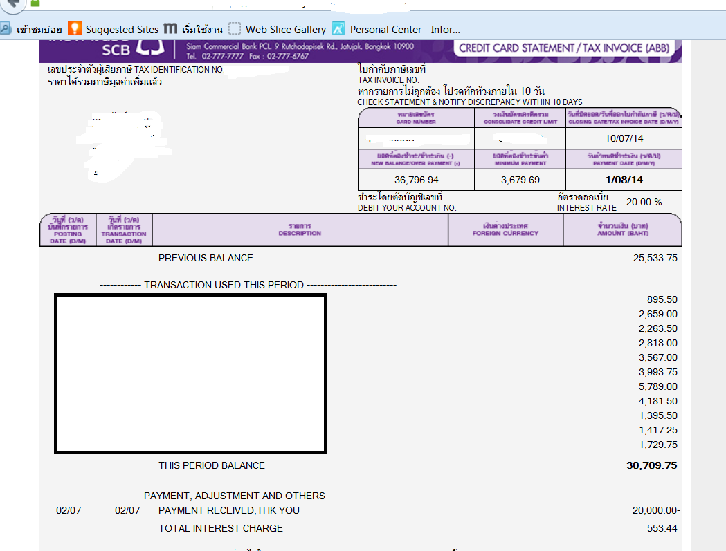 คือว่าปกติจ่ายเต็มจำนวนตลอดครับ SCB ครับ แต่เดือนที่แล้วเกิดอะไรบางอย่างทำให้จ่ายไม่เต็มจำนวนครับ (น่าตบกะบาลตัวเอง) ตามรูปเลยนะครับ คือยอดเดือนก่อนจ่าย 25,533 บาท ผมจ่ายไป 20,000 ครับ คงค้าง 5,533 บาทใช่ไหมครับ ยอดที่จ่ายเดือนนี้คือ 30,709 บาท กับที่ค้างรวมเป็น 36,769 บาท ชึ่งมีดอกเบี้นในนี้เป็นเงิน 553 บาท ผมโทรไป call center แล้วพอเข้าใจว่าถ้าจ่ายไม่ครบเขาจะคิดดอกเบี้ยทั้งหมดจากวันที่เราใช้ คือยังงงอยู่อยากกระจ่างครับ เพราะถ้าคิดดูนี่ มันร้อยละ 10 ของวงเงินคงค้างเลยนะครับ เพียงแค่เดือนเดียวครับ มันคิดดอกมากขนาดนี้เลยเหรอครับ มีท่านใดจะให้ความกระจ่างบ้างไหมครับ