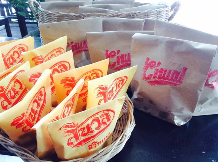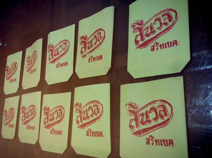 ว่าแล้วเราเริ่มทำบรรจุภัณฑ์ค่ะ โดยเริ่มแกะยางลบเป็นตัวปั๊ม (ขอบคุณวิชาศิลปะอีกที) และพับถุงจากกระดาษสมุดที่มีอยู่