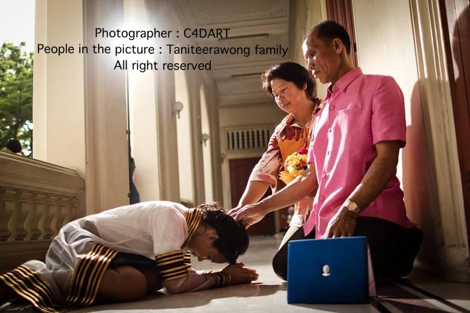 ในช่วงเวลาก่อนรับซีดีไฟล์รูป เรากับพี่ตากล้องก็มีติดต่อกันบ้างผ่านเฟชบุ๊ค มีวันหนึ่งพี่เค้าก็ส่งลิ้งพันทิพมาให้ บอกว่าภาพของเราได้ขึ้นเป็นกระทู้แนะนำ จากนั้นพี่เค้าก็ขออนุญาตเราเอารูปไปลง ภาพดังกล่าวก็คือภาพที่เรากราบพ่อแม่ค่ะ โพสลงพันทิพโดยพี่ช่างภาพเอง ไม่มีการ Process และการลงลายน้ำแสดงความเป็นเจ้าของแต่อย่างใด