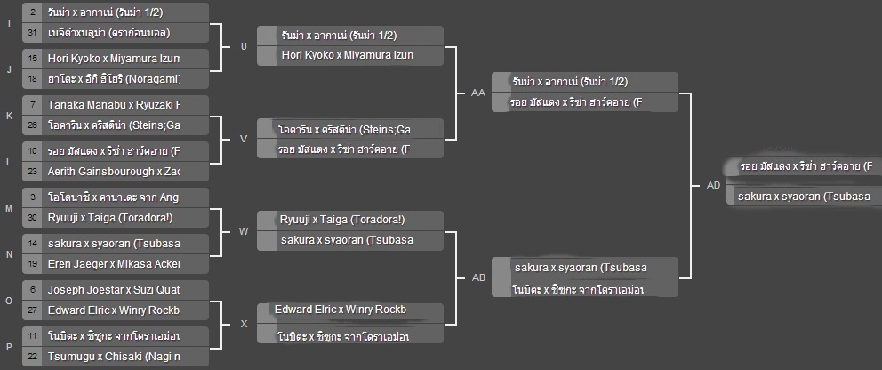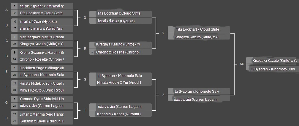 คู่สุดท้ายที่เชียร์จริงๆ ก็ไปซะแล้ว ขอเชียร์คู่ CCS กับ FMA ละกัน ยังไม่อยากเห็น ซากุระ-เชารัน ชิงกันเอง (ถ้าเป็นจริงโหวตครั้งต่อๆ คงต้องพิจารณาแบนคู่นี้ถาวร หรือแบนให้ลงได้แค่เรื่องเดียว ไม่ใช่ 2 เรื่อง โหดเกิน เว้นแต่มีอายานามิ เรย์ ละกัน