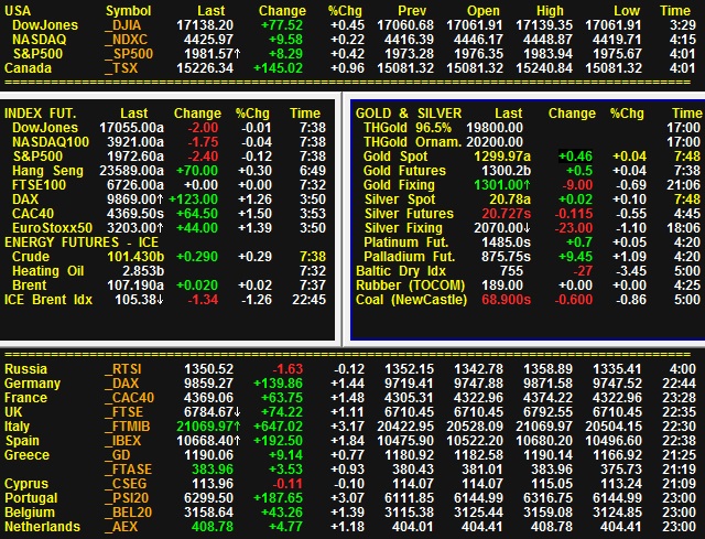 ดาวโจนส์ เพิ่มขึ้น 77.52 จุด (0.45 เปอร์เซ็นต์) ปิดที่ 17,138.20 จุด เอสแอนด์พี เพิ่มขึ้น 8.29 จุด (0.42 เปอร์เซ็นต์) ปิดที่ 1,981.57 จุด แนสแดค เพิ่มขึ้น 9.58 จุด (0.22 เปอร์เซ็นต์) ปิดที่ 4,425.97 จุด