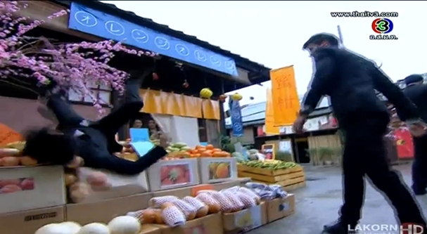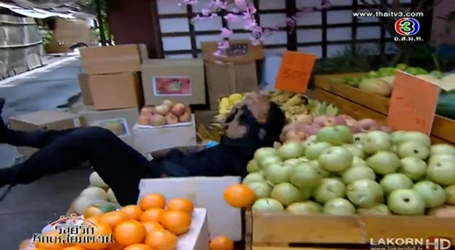 อ่อนโยน โยนผู้ร้ายไปที่อ่อนๆ เห็นมั๊ย โยนไปที่แผงผลไม้ของนางเอก เละเลย กลัวคนร้ายเจ็บถ้าโยนไปอีกทางที่เป็นกำแพง