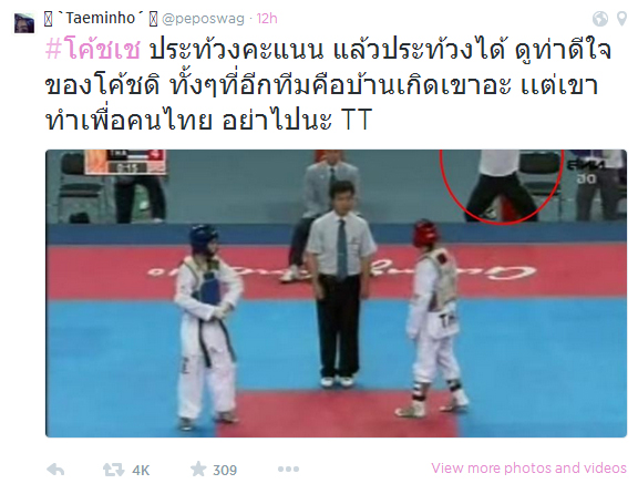 ซึ่งผู้ใช้ทวิตเตอร์รายนี้ ได้ทวีตภาพการแข่งขันเทควันโดระหว่างไทยและเกาหลีใต้ โดยมีโค้ชกำลังกระโดดตัวลอยด้วยความดีใจ พร้อมบรรยายภาพนี้ว่า "#โค้ชเช ประท้วงคะแนน แล้วประท้วงได้ ดูท่าดีใจของโค้ชดิ ทั้งๆ ที่อีกทีมคือบ้านเกิดเขาอะ เเต่เขาทำเพื่อคนไทย อย่าไปนะ TT"