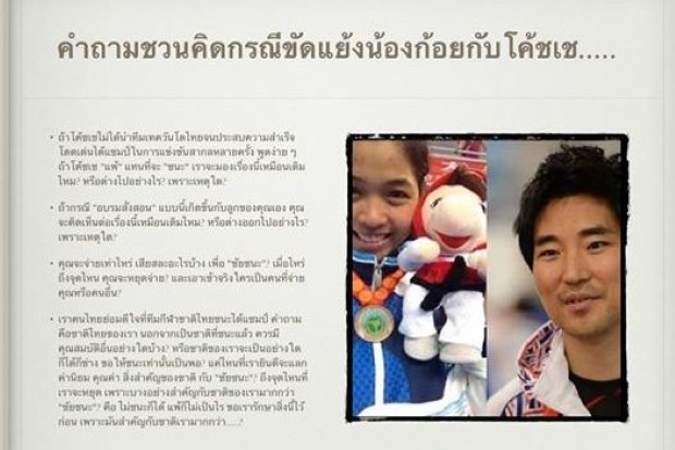 ตอบ : ฉันคิดว่า เราไม่ควรคำนึงถึงประเด็น แพ้ชนะ จนลืมเรื่องความเป็นจริงระหว่างลูกศิษย์กับครูอาจารย์ ในกรณีนี้ ไม่ว่าโค้ชเชจะเป็นเฮดโค้ชทีมชาติไทย หรือเป็นครูพละศึกษา พานักเรียนไปแข่งกีฬาระดับ อบต. ก็ตามแต่ ปัญหาเกิดขึ้นจากตรงที่ นักกีฬาร้องเรียนว่าโค้ชทำร้ายร่างกาย แต่ฝั่งโค้ชโต้แย้งว่า ไม่ได้ "ทำร้าย" แต่เขา "ทำโทษ" ที่สังคมกำลังลงโทษน้องก้อยอยู่ในขณะนี้ ไม่ใช่เพราะน้องแพ้ ! แต่เพราะสังคมกำลังตั้งคำถาม ที่ตัวน้องก็ไม่ยอมออกมาตอบเสียทีว่า "ที่น้องโดนโค้ชกระทำการเช่นที่น้องกล่าว เช่น ที่ว่าโค้ชต่อยหน้า 10 หมัดนั้น จริงหรือไม่ ? และสาเหตุที่แท้จริงที่น้องโดนโค้ชกระทำเช่นนั้น มาจากการขาดระเบียบวินัยและความรับผิดชอบในการแข่งขัน ทั้งที่น้องคือตัวแทนที่ไปในนามของประเทศไทย ใช่หรือไม่ ? และพ่อแม่หรือผู้ปกครอง มีส่วนทำให้น้องต้องตกเป็นจำเลยสังคมในครั้งนี้ด้วยหรือไม่ ?"