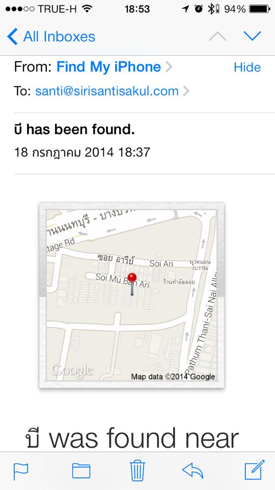 วันนี้ iCloud ได้ส่ง Email มาให้ เพราะเครื่อง iPad ของลูกชายที่โดนขโมยไปหลายเดือนก่อน ได้ถูกเจอแถว ถนน 345 หมู่บ้านอารีย์