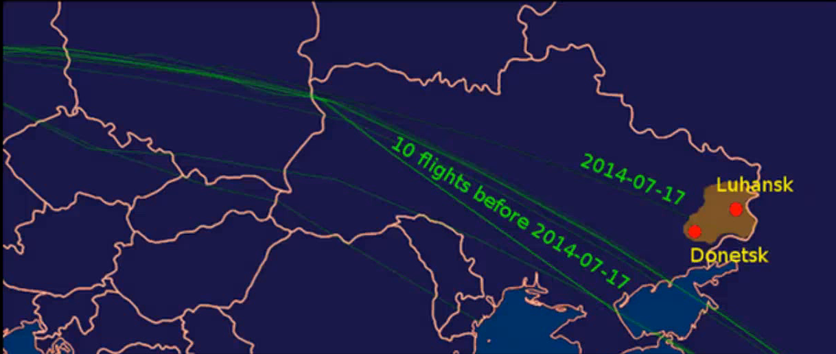 จอเรด้ายังแสดงการเปลี่ยนแปลงที่อธิบายไม่ได้ของเส้นทางการบินของมาเลเซียแอร์ไลนส์ การเปลี่ยนแปลงนำเครื่องบินเข้าสู่เขตที่มีความขัดแย้งในภูมิภาคตะะวันออกของยูเครน