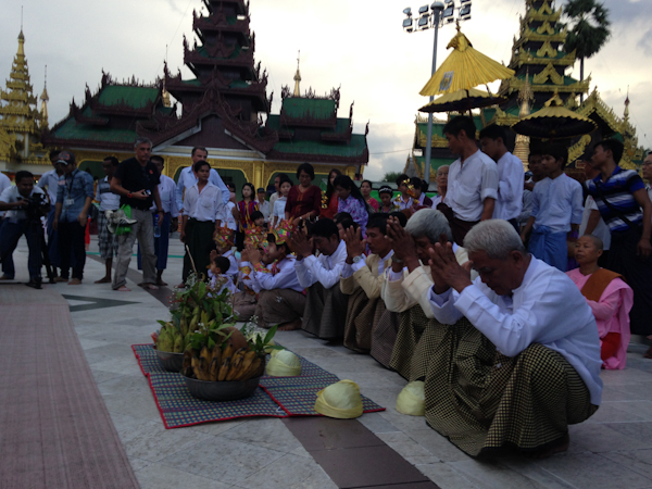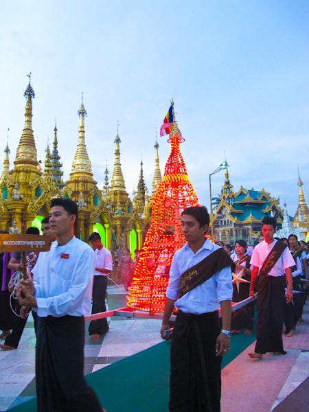 สุดท้ายก็มาจบที่ มหาเจดีย์ชเวดากอง เราไปกันตอนเย็นๆ อะครับ อยู่จนค่ำเลยครับ วันที่พวกเราไปมีจุดเทียนรอบๆ มหาเจดีย์ และยังมีขบวนพาเรดของชาวเมืองแห่รอบมหาเจดีย์ เห็นคนพม่ามาวัดกันเยอะมากก คนในประเทศเค้าให้ความสำคัญกับศาสนาพุทธ มากเลย ไม่ได้มีเฉพาะคนแก่นะ มีทั้งเด็ก คนหนุ่มสาว วัยทำงาน เรียกได้ว่าทุกช่วงวัยจริงๆครับ