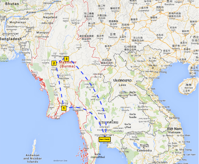 แผนที่การเดินทางของทริปนี้ เริ่มที่ กรุงเทพฯ ไป ย่างกุ้ง ไป พุกาม ไป มัณฑะเลย์ กลับ กรุงเทพฯ
