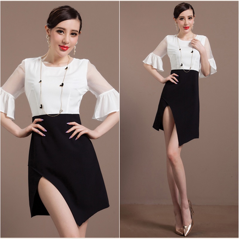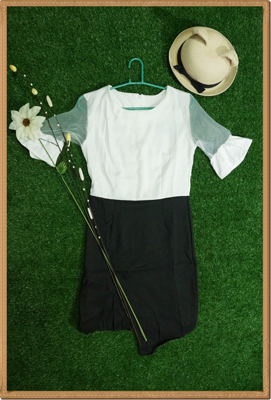 เดรสตัดต่อเข้าชุดเดียวกัน ช่วงแขนซีทรู ช่วงกระโปรงผ่าด้านหน้า ซิปหลัง ทรงสวย