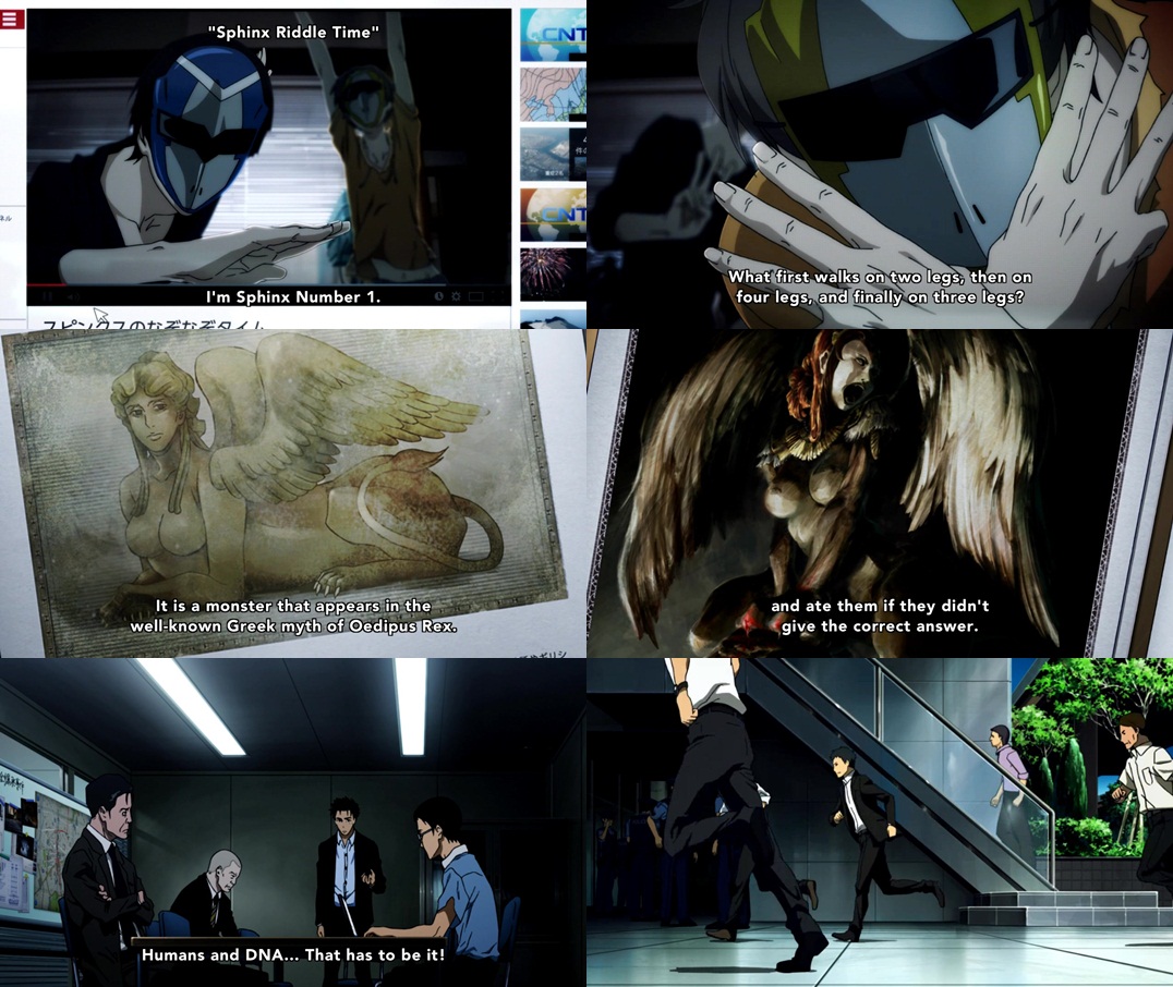 ตำรวจได้คำตอบคือ มนุษย์ จากตำนาน Sphinx ที่ถามคำถามผู้บุกรุกว่า "อะไรเอ่ย เช้าเดิน 4 ขา บ่ายเดิน 2 ขา ค่ำเดิน 3 ขา"