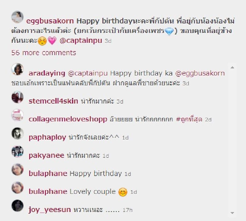 นาน ๆจะโชว์หวานออกสื่อให้แฟนคลับได้อิจฉากัน สำหรับคู่รักต่างวัยอย่างนักแสดงสาว เอ้ก บุษกร ตันติภนา กับหนุ่ม กัปตัน ภูธเนศ หงษ์มานพ ล่าสุดวันเกิดของหนุ่มกัปตันที่ผ่านมาฝ่ายหญิงก็ได้โพสต์อวยพรแฟนหนุ่มในอินสตาแกรม ด้วยคำอวยพรที่สุดแสนโรแมนติกทำเอาหลายคนที่พากันเข้าไปส่อง ต้องรีบหาน้ำมาดับไฟที่ตาด่วน