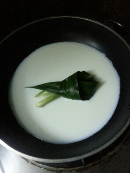 เมื่อได้นมที่อบควันเทียนมาแล้ว ก็ตั้งกระทะเทนมลงกระทะ ตามด้วยใบเตยครับ ไม่ต้องใช้ไฟแรงนะครับ คอยคนตลอดไม่งั้นนมจะจับเป็นก้อนครับ