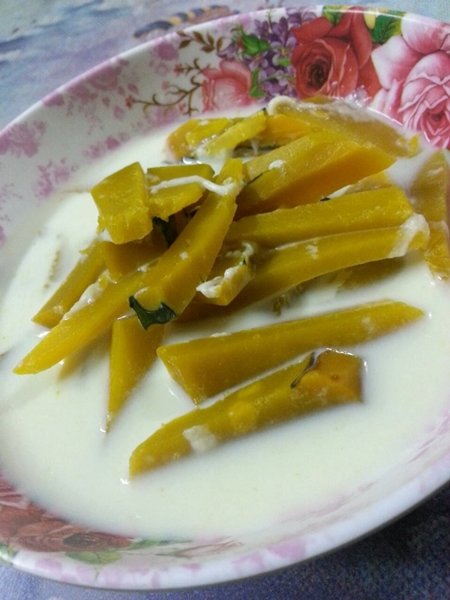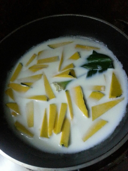 พอนมเริ่มร้อนก็ใส่ฟักทองตามลงไปได้เลยครับ แต่ฟักทองก่อนที่จะนำมาใช้ ให้นำไปแช่น้ำที่ใส่ผงฟูประมาณ 30 นาทีครับ