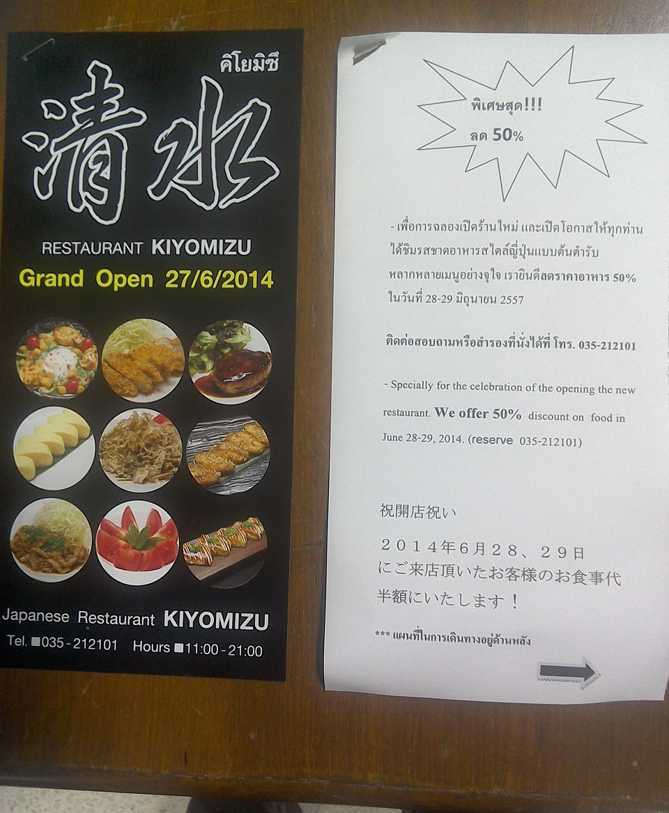 ผมได้มีโอกาสไปกินร้านอาหารญี่ปุ่นแห่งหนึ่ง ย่านอยุธยา ในห้างthe sky หลังจากสอบ กพ. เสร็จ(ดองรีวิว) อันที่จริงเจ้าของร้านเป็นแฟนเจ้ที่ทำงานผม เจ้ทำงานเลยทำการโปรโมทร้านตัวเองตั้งแต่ก่อนร้านเปิดเป็นเดือน อันตัวผมจริงๆไม่ชอบอาหารญี่ปุ่นเอาซะมาก(ผมชอบรสจัดจ้านแบบไทยๆครับ) แต่ด้วยในใบปลิวมันเขียนซะเรียบร้อยว่า"เพื่อการฉลองเปิดร้านใหม่ และเปิดโอกาสให้ทุกท่านได้ชิมรสชาดอาหารสไตล์ญี่ปุ่นแบบต้นตำรับหลากหลายเมนูอย่างจุใจ เรายินดีลดอาหาร50% ในวันที่ 28-29 มิถุนายน 2557" ผมอ่านครั้งแรกขำครับ สุภาพมาก แต่ก็มีบางอย่างที่ดึงดูดผมมาก ไหนๆ ก็สมัครสอบ กพ ที่อยุธยาละ แวะซะหน่อยก็ละกัน ลดต้อง 50% ห้าๆ