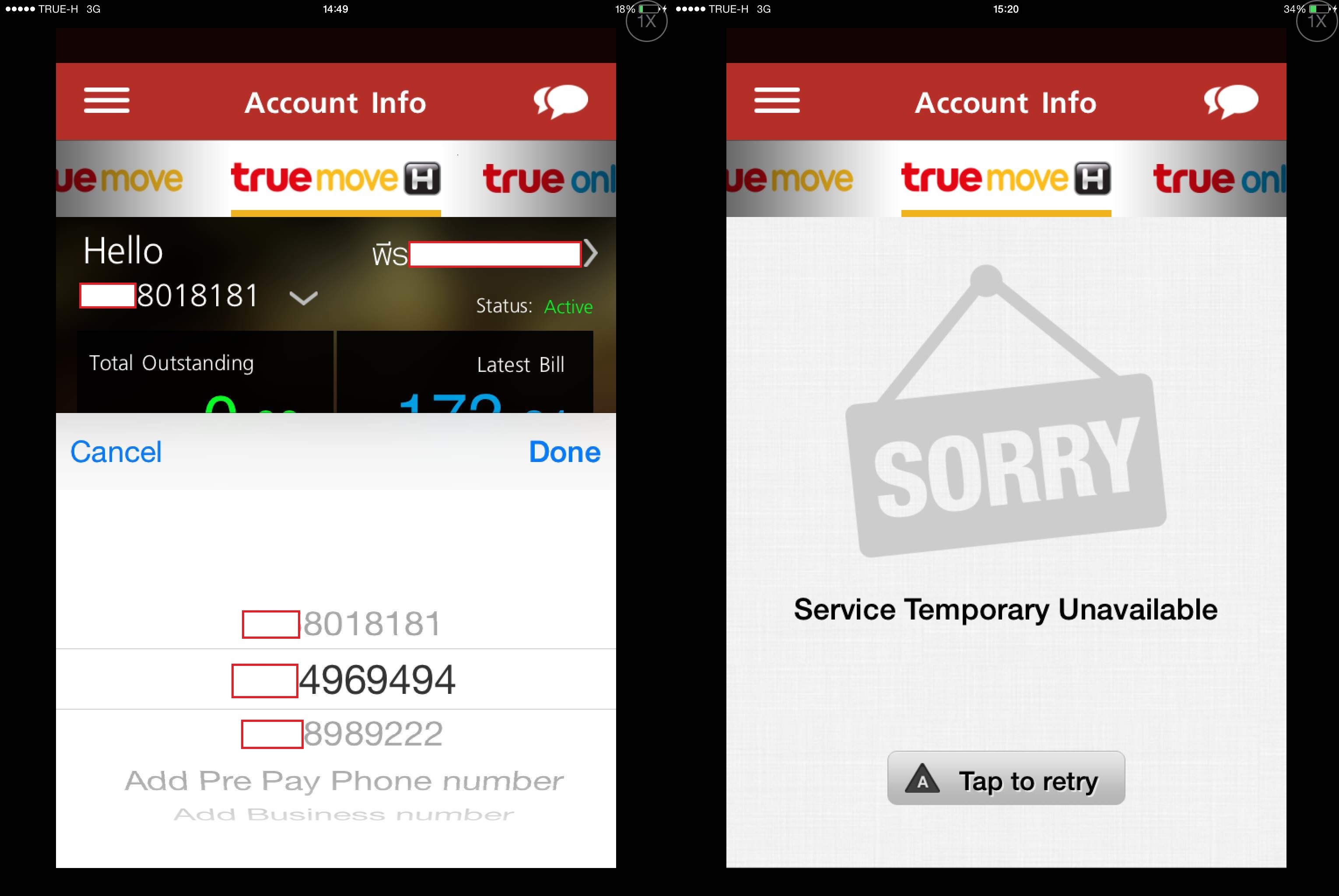 True iservice เบอร์ที่ 2 และ เบอร์ที่ 3 ไม่สามารถเช็คยอดการใช้งานได้ครับ เช็คได้เเบอร์เดียว คือ 8018181 ส่วนเบอร์ 4969494 กับ 8989222 ขึ้น Service Temporary Unavailible ดังรูป เป็นมาแต่ตั้งแต่วานแล้วครับ รบกวนประสานงานกับหน่วยงานที่เกี่ยวข้องแก้ไขให้ด้วยครับ