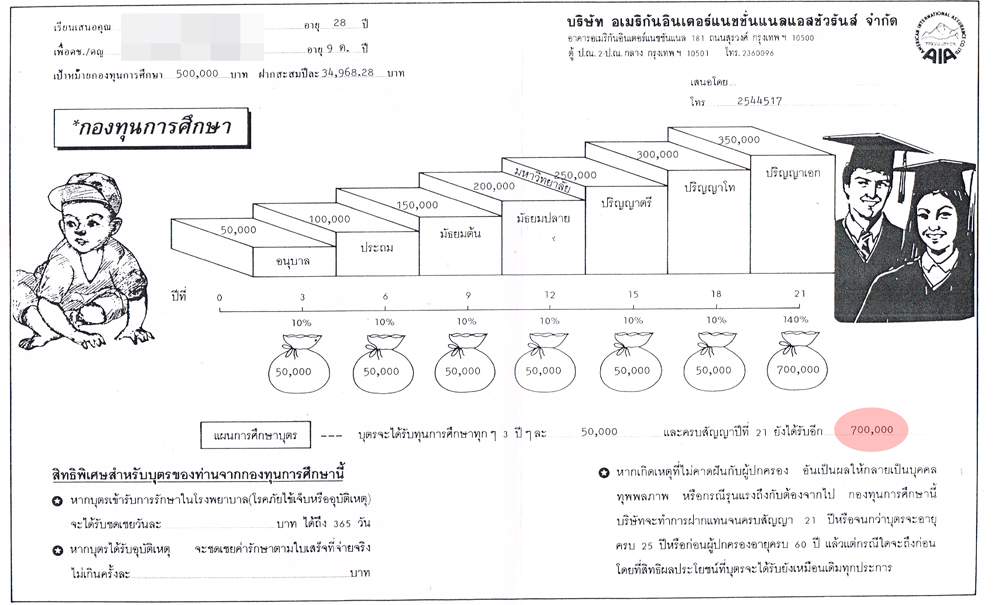 ในสัญญาซึ่งมีตราบริษัท AIA ระบุว่า ครบกำหนด 21 ปี จะได้รับเงินคืนทั้งสิ้น 700,000 บาท