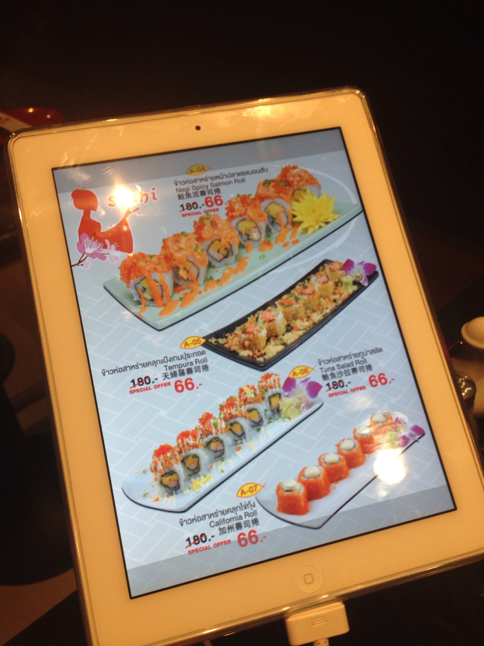 รู้สึกประหลาดใจที่ทางร้านใช้ ไอเพดเป็นเมนู ถ้าจะให้ดีกด ออร์เดอร์ไปถึงในครัวเลยจะดีมาก 555 ซึ่งไม่ค่อยได้เห็นทางร้านอาหารญี่ปุ่นที่ดังๆ และ แพงๆ แต่เมื่อเห็นราคาอาหารแล้วก็รู้สึกสบายกระเป๋าเลยทีเดียว