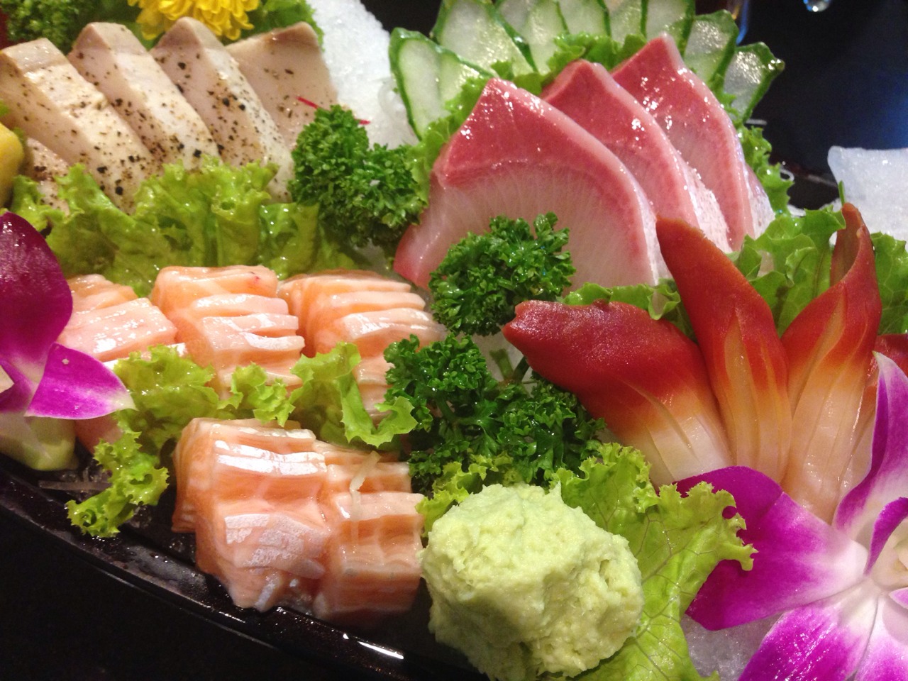 ท้องปลาเซลมอน 155 บาท ทูน่าขาว 99 ทูน่า อากามิ 99 ไข่หวาน 33 หอยปีกนก 99 บาท อร่อยมากกก ของสดและไม่แพงอย่างที่คิด ให้เยอะ โคตรๆ ทางร้านใช้วาซาบิสด