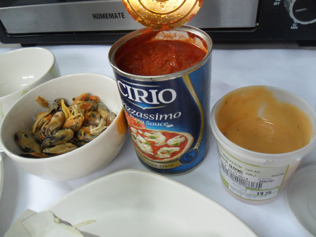 2.จัดแจงเทซอสมะเขือเทศสำหรับทำพิซซ่าลงไปเลยอ่ะ เกลี่ยๆให้ทั่วๆหน่อย ก็ใช้ได้แล้วค่ะ