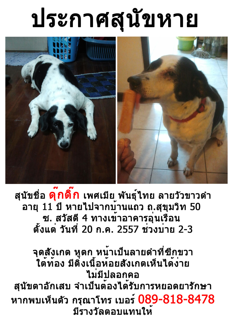 ดุ๊กดิ๊กหายไปตั้งแต่เมื่อวันอาทิตย์ที่ 20 ก.ค. 2557 ที่ผ่านมาค่ะ คาดว่าน่าจะช่วงเวลาบ่าย 2-3 หลุดออกไปจากบ้านเพราะพี่ชายเปิดประตูบ้านออกไปข้างนอก คิดว่าน่าจะวิ่งออกไปช่วงนั้น เราลงมาหามันตอนประมาณ 4 โมงเย็น แล้วไม่เจอเลยถามลุงข้างบ้าน แกบอกว่า ช่วงบ่าย 2-3 แกปั่นจักรยานผ่าน เห็นมันนั่งอยู่หน้าบ้านเราแต่เข้าไม่ได้เพราะประตูปิด แกก็ไม่ได้คิดอะไร ปั่นจักรยานเลยไป หลังจากนั้นฝนก็ตกค่ะ เราเลยไม่รู้ว่ามันวิ่งไปหลบฝนหรือเตลิดไปถึงไหนแล้ว