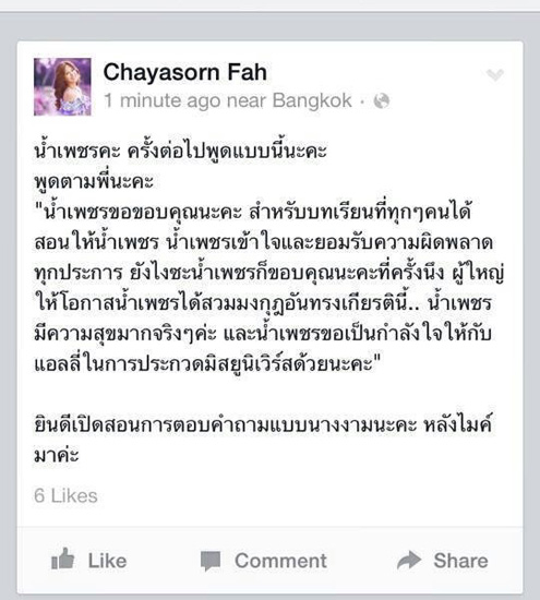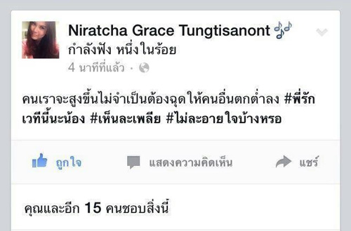 ส่วน ''เกรส'' ณิรัฐชา ตังติสานนท์ รองมิสไทยแลนด์ยูนิเวิร์ส อันดับ 1 ประจำปี 2554 ได้โพสต์ในเฟซบุ๊คว่า@ คนเราจะสูงขึ้น ไม่ตำเป็นต้องฉุดให้คนอื่นต่ำลง# พี่รักเวทีนะน้อง# เห็นละเพลีย#ไม่ละอายบ้างหรอ