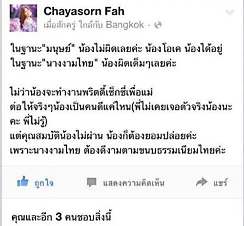 @@ ในฐานะน้องเป็นมนุษย์ น้องไม่ผิด น้องโอเค น้องได้อยู่ ในฐานะนางงามไทยน้องผิดเต็มๆเลยคะ ไม่ว่าน้องจะทำงานพริตตี้เซ็กซี่เพื่อแม่ ต่อให้น้องเป็นคนดีแค่ไหน(พี่ไม่เคยเจอตัวจริงน้องค่ะพี่ไม่รู้) แต่คุณสมบัติน้องไม่ผ่าน น้องต้องยอมปล่อยคะ เพราะนางงามไทยย่อมต้องดีตามขนบธรรมเนียมไทย