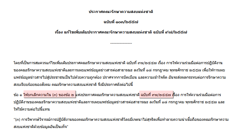 ประกาศ คสช ฉบับที่ 103/2557 ยกเลิก (๓) ข้อ ๒ ของประกาศ คสช ฉบับที่ 97/2557 ข้อเท็จจริง ต้องเป็น (๓) ข้อ ๓