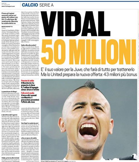 ตุ๊ตโต้ สปอร์ต สื่อเมืองตูรินรายงานข่าวล่าสุดว่า แมนฯยูไนเต็ดได้กลับมาพร้อมกับข้อเสนอล่าสุดที่ 43 ล้านยูโร บวกโบนัส และอาจเพิ่มไปถึง 48 - 50 ล้านยูโร ตามเป้าหมายที่ทีมได้กำหนดไว้ในสัญญา หลังจากข้อเสนอแรกที่ 40 ล้านยูโร บวกโบนัสอีก 3 ล้านยูโร โดนปฏิเสธโดยยูเวนตุส ซึ่งทีมดังแห่งเมืองตูรินต้องการได้ค่าตัววิดัลอย่างน้อยที่ 45 ล้านยูโร และข้อเสนอล่าสุดจากยูไนเต็ดน่าจะทำให้ดีลนี้ปิดตัวลงได้สำเร็จ