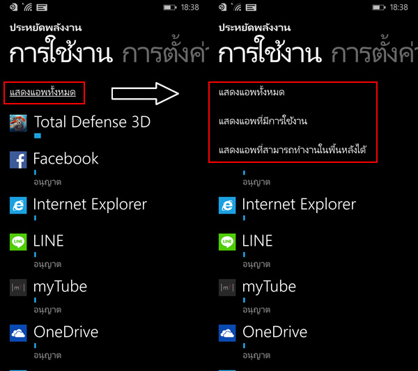 Battery Saver (ชื่อไทย: ประหยัดพลังงาน) ที่มากับ Windows Phone 8.1 เป็นแอพแยกแล้ว