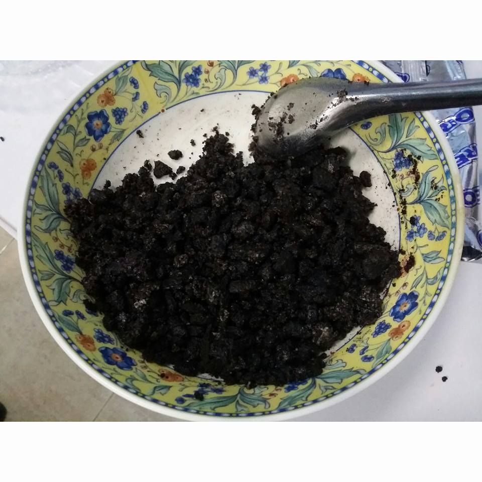 1. แยกโอริโอ้ออกจากครีม ((เราเก็บครีมไว้ค่ะ)) แล้วนำโอริโอ้ไปบด ตี ทุบให้ระเอียด
