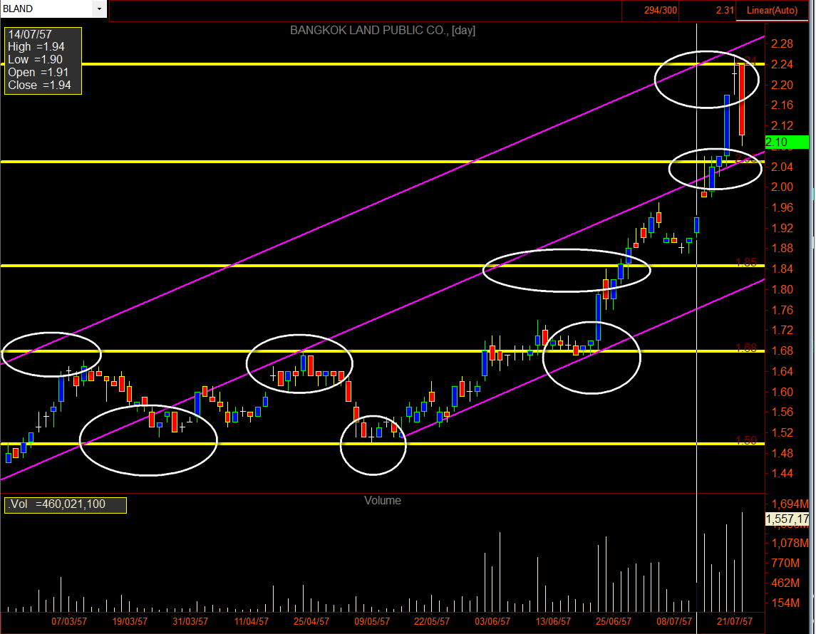 Bland ---- timeframe day กราฟทำสัญญานการกลับตัวสวย มีการเบรกเทรนไลน์ขาลง ออกได้ (เส้นสีน้ำเงิน) หลังจากนั้นพอเบรกเทรนไลน์ ก็มีการเบรกแนวต้านในแนวระดับได้อีก (เส้นสีชมพู) แบบนี้ถ้าราคาย่อลงมาแถวเส้นชม
