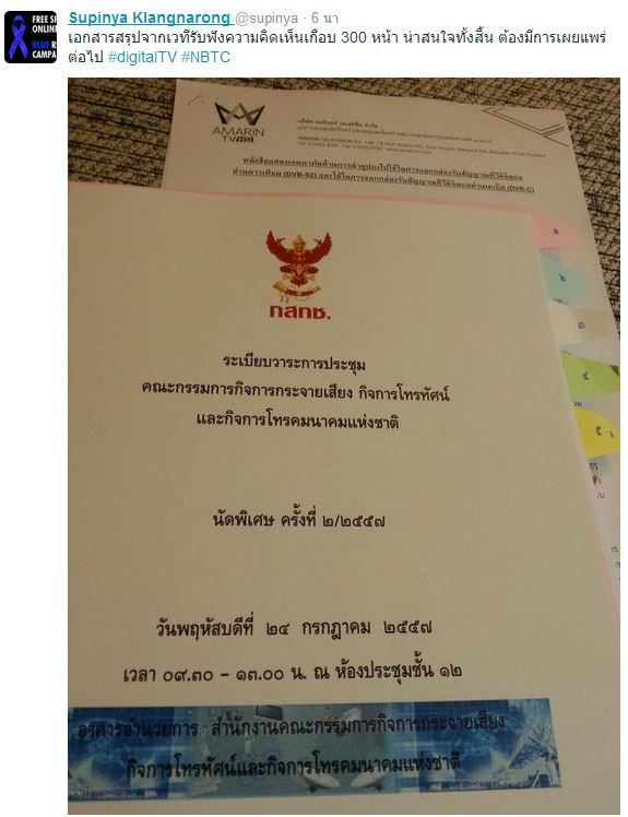 กสทช.สุภิญญา กลางณรงค์ @supinya ทวิตว่าเอกสารสรุปจากการประชาพิจารณ์มีถึง 300 หน้า!!!