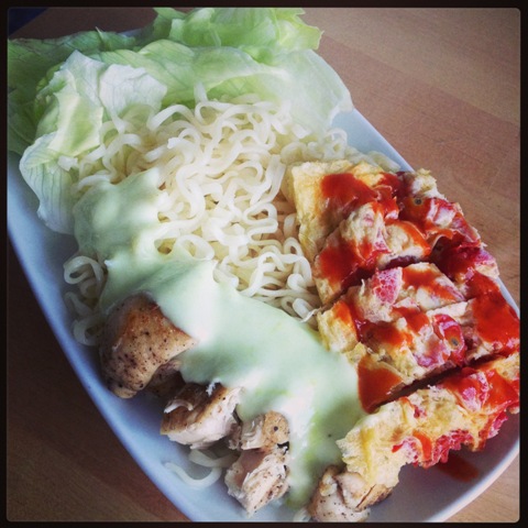 บะหมี่เย็น กินคู่กับอกไก่ย่างราดซอสวาซาบิ และไข่เจียวมะเขือเทศ