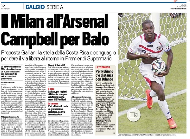 รายงานข่าวระบุว่า เอซี มิลาน ต้องการขาย บาโลเตลลี่ ให้กับทีมปืนใหญ่ ด้วยค่าตัวสุดถูก แบบไม่น่าเชื่อแค่ 10 ล้านยูโร หรือ 7.9 ล้านปอนด์ (หรือประมาณ 427 ล้านบาท) หากมี โจเอล แคมป์เบลล์ เป็นส่วนหนึ่งของสัญญา หลังดาวยิงทีมชาติคอสตาริกา วัย 22 ปี โชว์ฟอร์มได้ดีในการแข่งขันฟุตบอลโลก 2014 ที่ประเทศบราซิล