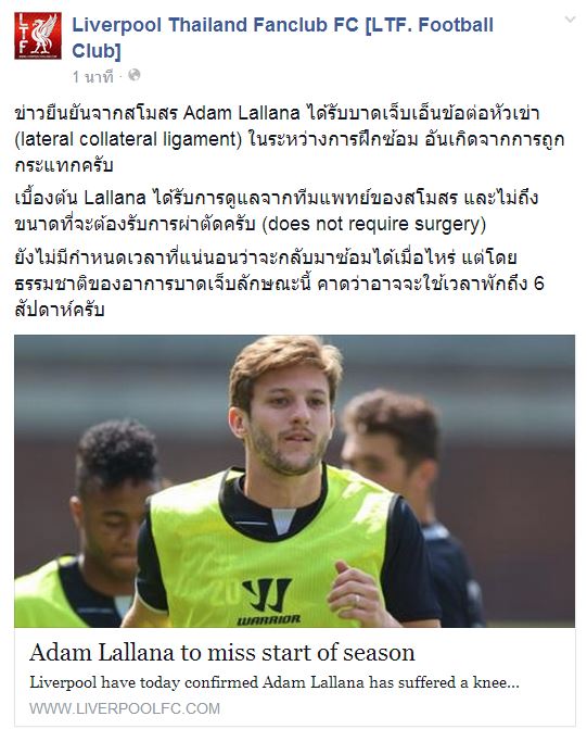 < < < Liverpool update !!! อัพเดตข่าวตลาดชื้อขายนักเตะ" ลิเวอร์พูล " + ลัลลาน่าเจ็บ อาจะพักถึง 6 สัปดาห์ > > >