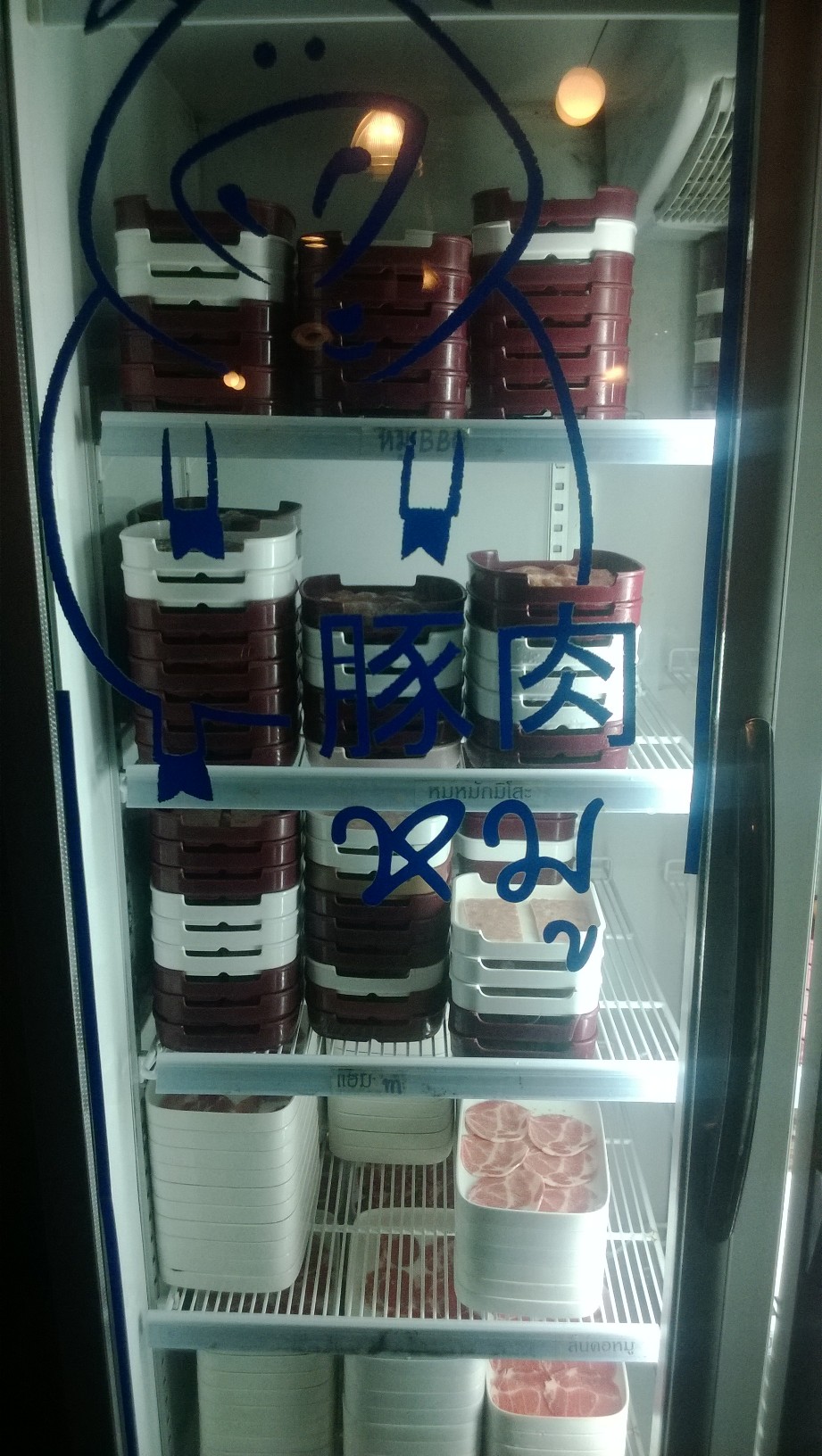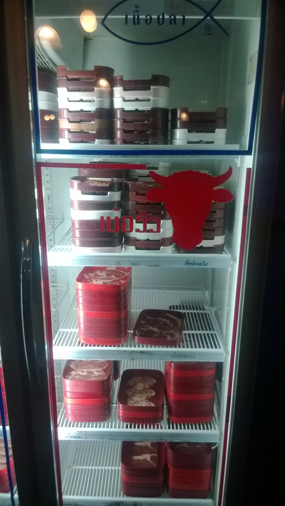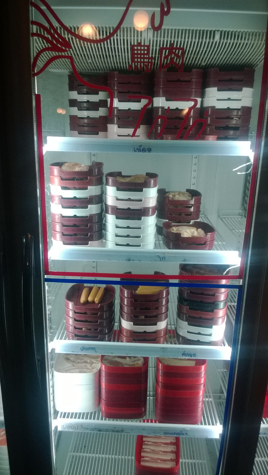 ในร้านจะแบ่งตู้เย็นไว้สามช่องค่ะ ซึ่งประกอบด้วยช่องหมู ช่องไก่และช่องปลา-เนื้อวัว