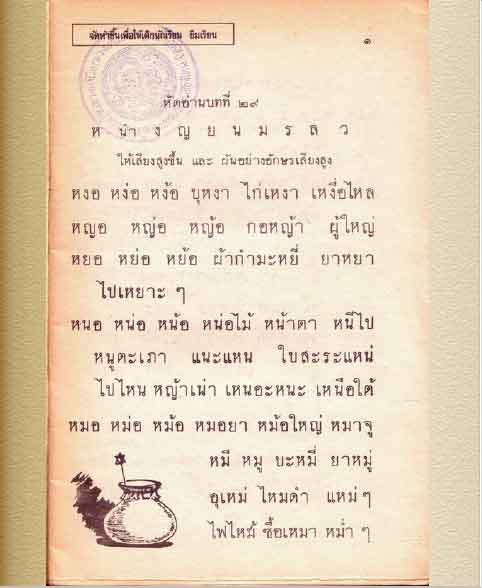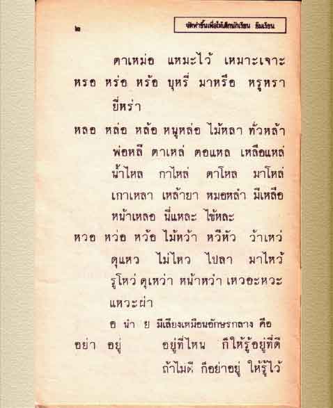 ก่อนที่จะไปเนื้อเรื่อง จะเป้นแบบหัดอ่าน ซึ่งลองอ่านดูเด็ก ป.1 สมัยนี้คงอ่านได้ยาก เพราะมีทั้งการควบกล้ำ สอนผันคำก่อน อย่าง หลอ หล่อ หล้อ ทำให้เด็กรู้หน้าที่ของเสียงวรรณยุกต์ไปในตัว สอนกันเป็นชุดของคำ เช่น หมอ หนอ หลอ ... แล้วยกตัวอย่างคำ เช่น หนอ หน่อ หน้อ หน่อไม้ หน่อยา ยอหมู่ อะไรแบบนี้ ทำให้อย่านง่าย ผสมคำง่าย