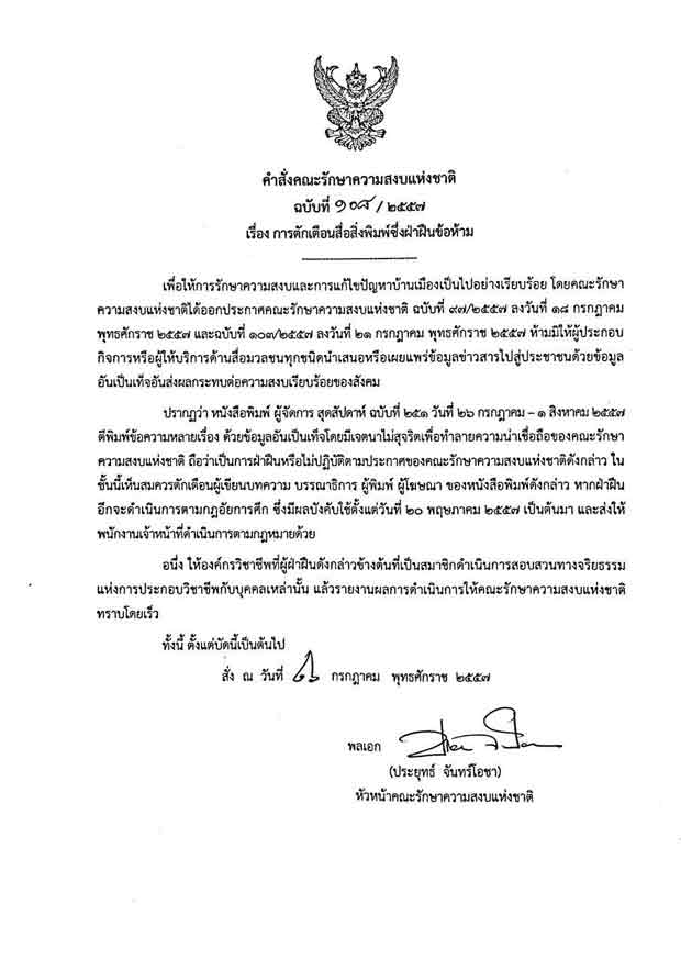 คณะรักษาความสงบแห่งชาติออกคำสั่งที่108/2557 ตักเตือนหนังสือพิมพ์ผู้จัดการสุดสัปดาห์ ฉบับที่26ก.ค.-1ส.ค.2557 ตีพิมพ์ข้อความหลายเรื่องด้วยข้อมูลอันเป็นเท็จโดยมีเจตนาไม่สุจริตเพื่อทำลายความน่าเชื่อถือของคณะรักษาความสงบแห่งชาติถือว่าเป็นการฝ่าฝืนหรือไม่ปฎิบัติตามประกาศของคณะรักษาความสงบแห่งชาติ.......