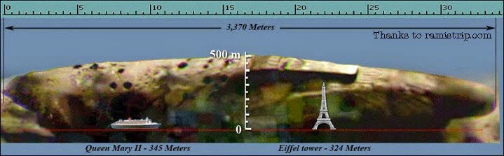ขนาดของมันสูงกว่าครึ่งกิโลเมตร และอาจจะยาวกว่า 3.37 กิโลเมตรก็ได้ เห็นเป็นวัตถุที่ มีรายละเอียดมีความสมดุล และมีการออกแบบ แตกต่างจากสิ่งแวดล้อมและพื้นผิวที่อยู่รอบตัวมากทีเดียว