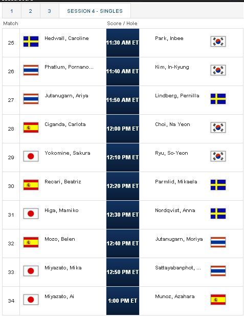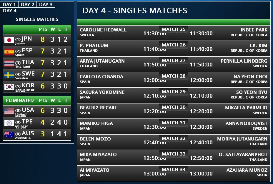 โดยทัพไทยคนแรกโปรแหวน พรอนงค์เจอกับ I.K. Kim จากเกาหลี ตามด้วย โปรเม เอรียา เจอกับ Pernilla Lindberg จากสวีเดน ส่วนโปรโม โมรียา เจอกับ Belen Mozo จากสเปน และโปรหมู อรนรินทร์ เจอกับ Mika Miyazato จากญี่ปุ่น