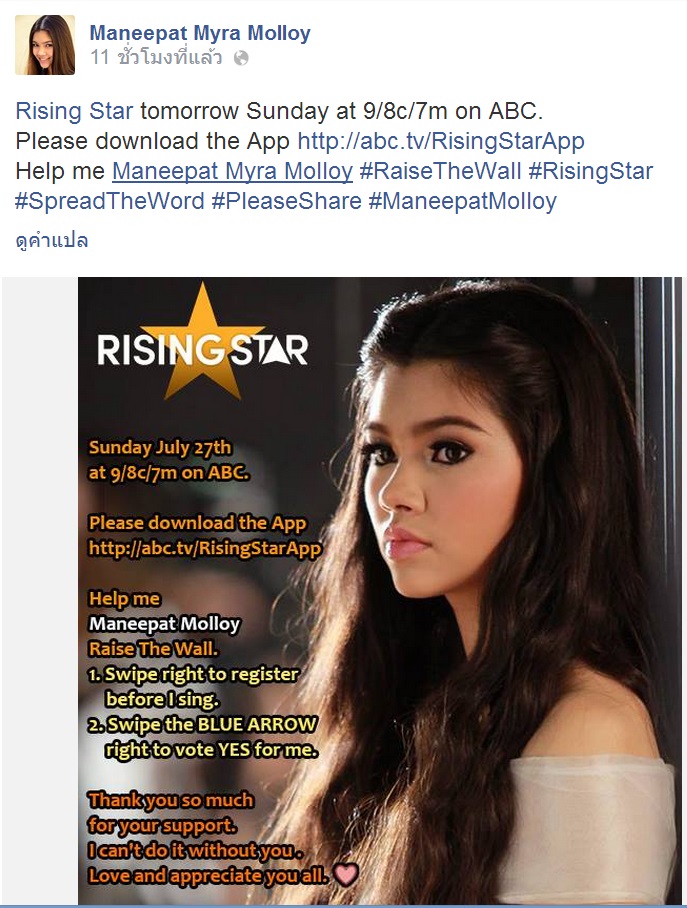น้องไมร่าจะเข้าแข่ง ในรายการ Rising Star ทาง ABC