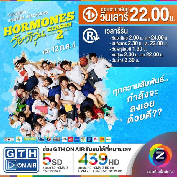 ซีรียส์สุดฮิต Hormones วัยว้าวุ่น ซีซั่น 2 ออกอากาศตอนแรกไปแล้ว โดยเริ่มตอนแรกเมื่อวันที่ 12 ก.ค. 2557 เวลา 22:00 น. ที่ผ่านมา ปกติแล้วออกอากาศทางช่อง SD 5 และ HD 439 ผ่านกล่อง GMM Z นอกจากกล่อง GMM Z แล้วเรายังสามารถติดตามซีรียส์วัยว้าวุ่นนี้ได้ผ่านช่องทางไหนบ้างนะ ?