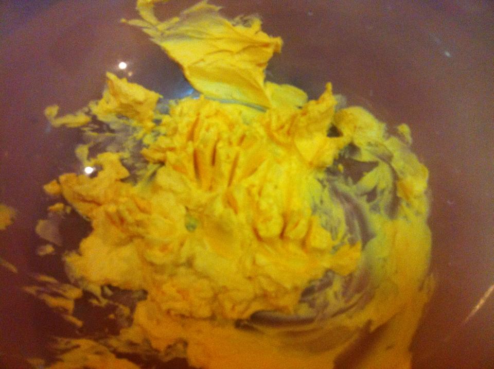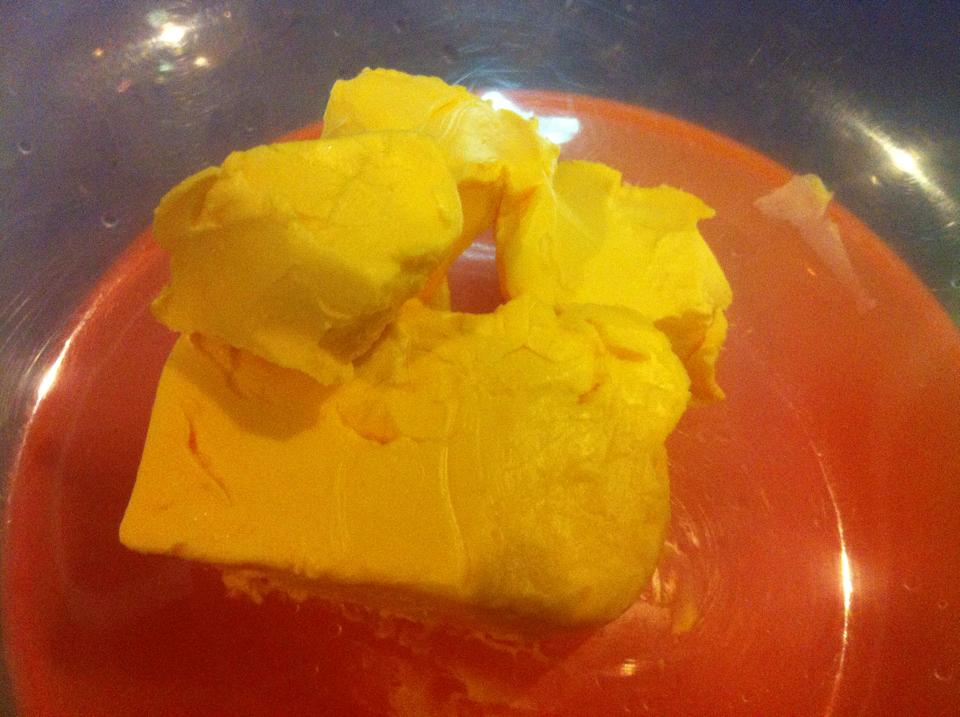 ลำดับแรก เทเนยลงภาชนะแล้วตีพอให้เนื้อเนยเข้ากัน