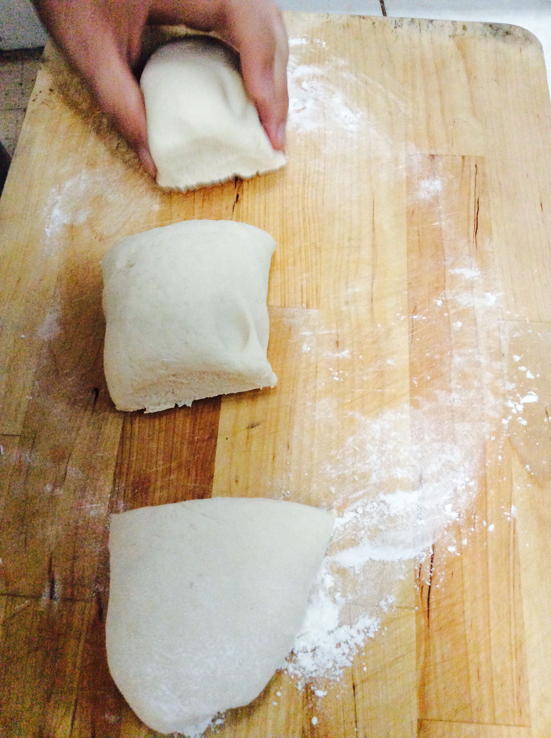แป้งที่ทิ้งไว้ครบ 30 นาทีแล้ว ก็นำมาตัดแบ่งเป็น 3 ชิ้น ( 3 ถาดตามสูตรของคุณ 13 Destinations)