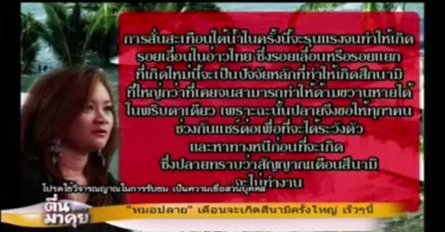 ทำนายสึนามิมา 3 รอบ ระบุวัน 5 - 17 มิย และ วันที่ 20 - 25 เดือนมิย หรือ กค 2557 ระบุพื้นที่ ชาวบ้านที่เคยเจอสึนามิมีปมอยู่แล้ว แถมทำเศรษฐกิจท้องถิ่นเสียอีก