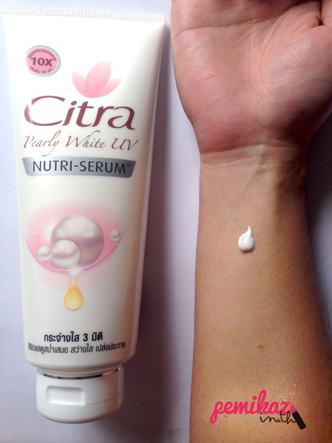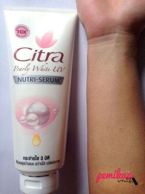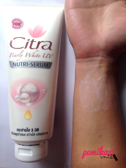 Citra Pearly White UV Nutri-Serum : ซึมลงผิวได้ไวมาก เพียงถูกไป มา ประมาณ 2-3 ครั้งก็ซึมเข้าผิวได้เรียบเนียนและไม่เหนาะหนะ
