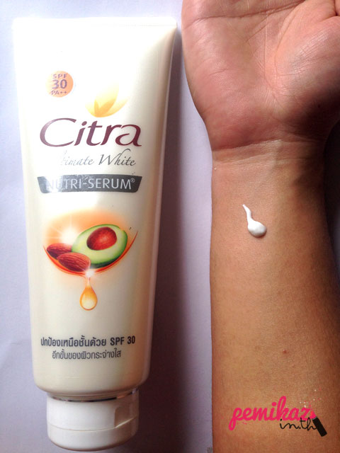 Citra Ultimate White Nutri-Serum SPF30 PA++ : นับเป็นโลชั่นที่มีส่วนผสมของกันแดดที่ไม่เหนียวที่สุด ซึมไวมาก ไม่เป้นปื๊ด ขาวๆ (กันแดดหลายๆแบรนด์เป็น) เป็นตัวที่เปรมใช้ทาทุกวันค่ะ ฟินลืม!