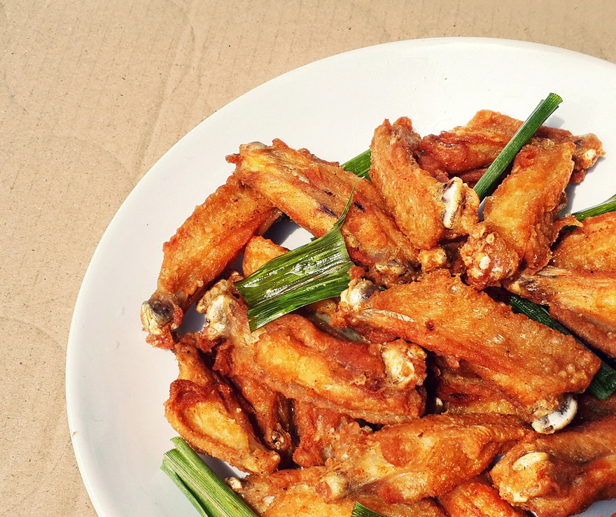 วัตถุดิบมีแค่ 4 อย่าง (ปีกไก่ น้ำปลา แป้งมัน น้ำมัน)ปีกกลาง 500 กรัมน้ำปลา 3 ชต ล้างปีกไก่ด้วยเกลือ กำจัดความคาวใช้มีดกรีดตรงกลางปีกเพื่อให้น้ำปลาเข้าเนื้อและทอดสุกง่าย ชุบแป้งมัน เอาไก่ใส่ในถุงพลาสติ